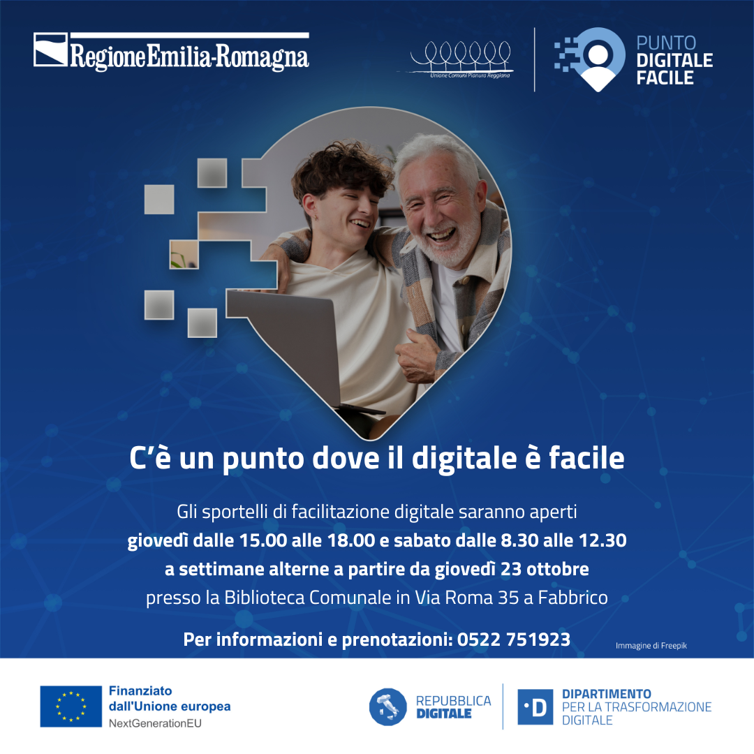 Basta prenotare un appuntamento attraverso il portale dedicato https://affluences.com/digitale-facile-unione-pianura-reggiana/reservation oppure chiamare il numero verde 800 141147 che offrirà l’assistenza e le informazioni necessarie sia per la prenotazione (se richiesto) che per l’accesso allo sportello oppure contattare direttamente la Biblioteca di Fabbrico (0522/751923 - biblioteca@comune.fabbrico.re.it).