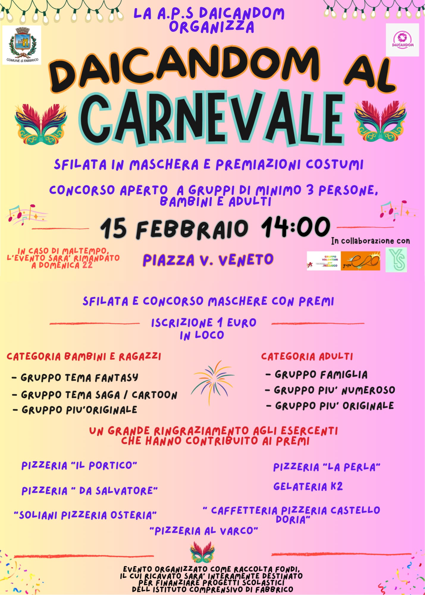 Domenica 15 Febbraio dalle ore 14, vi aspetta una grandiosa sfilata in maschera con concorso a premi aperto a gruppi di minimo 3 persone, grandi e piccini.