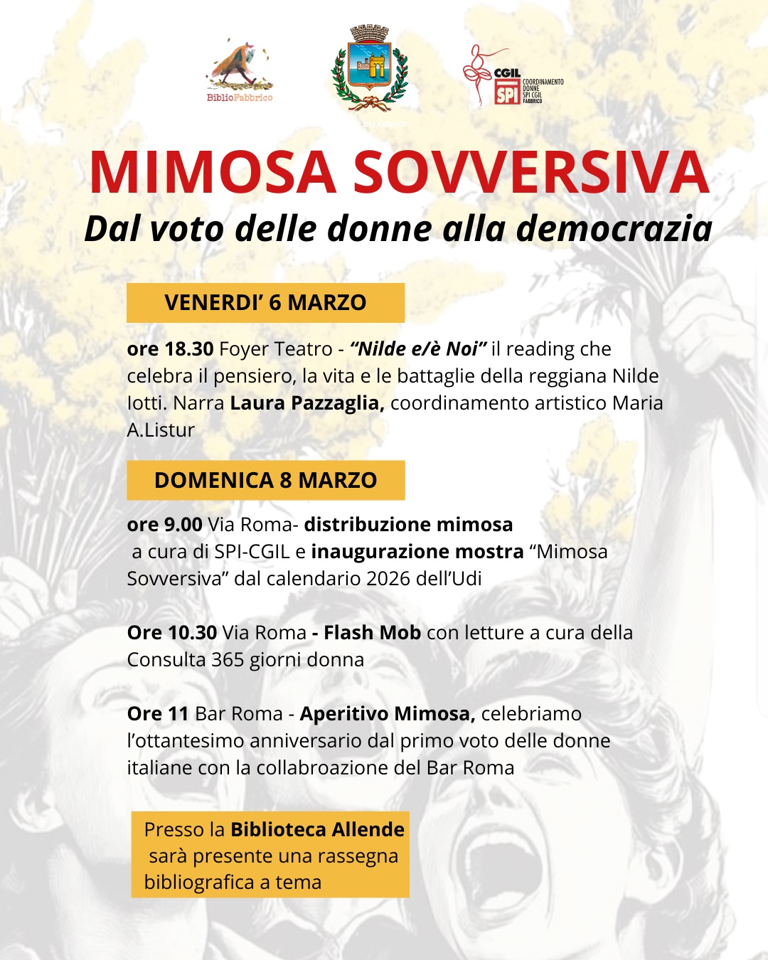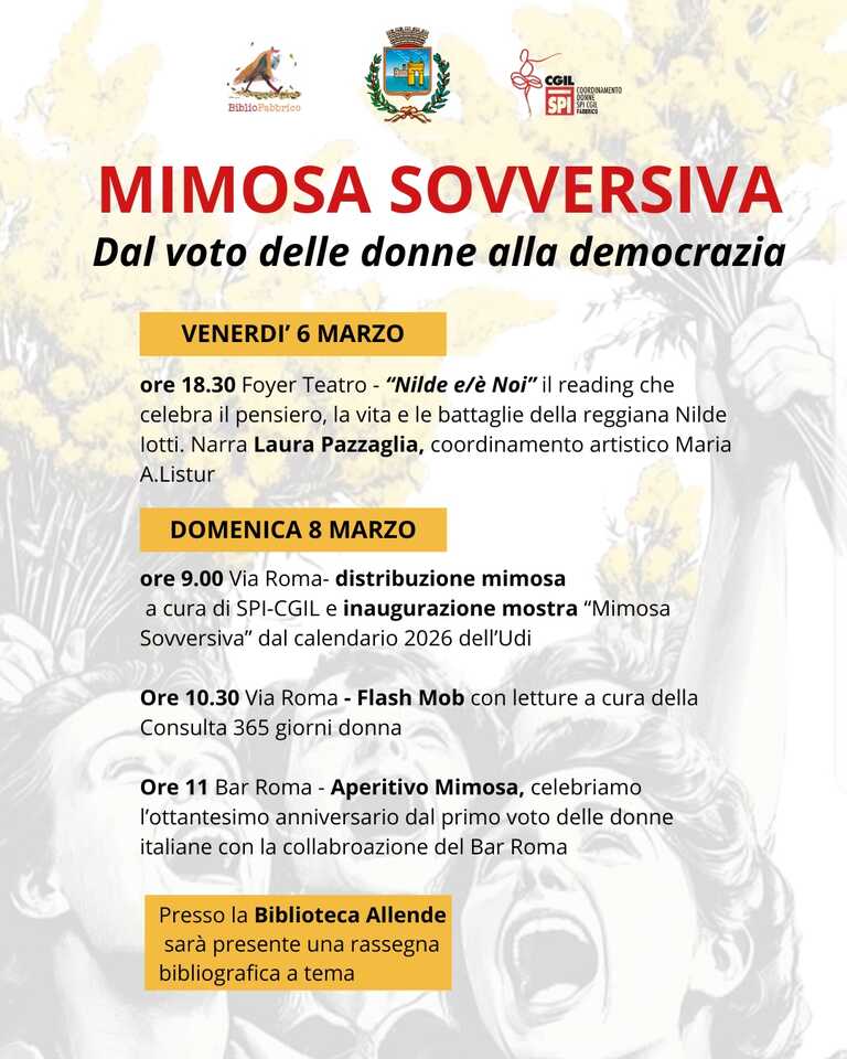 - ore 9.00 distribuzione mimose ed inaugurazione della mostra a cura di SPI-CGIL Fabbrico;
